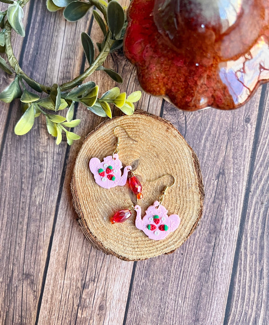 Tea Pot Earrings - Pink Strawberries